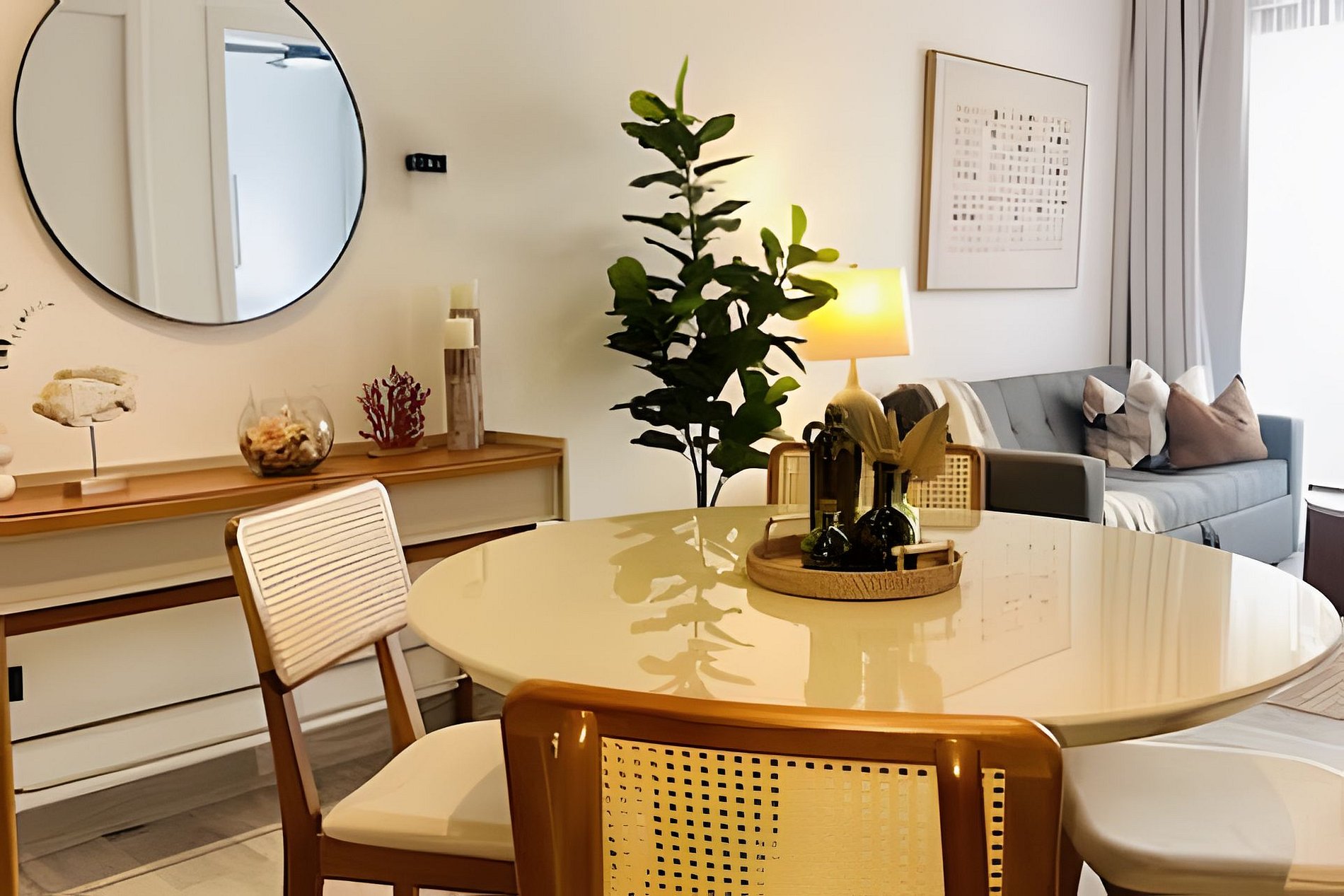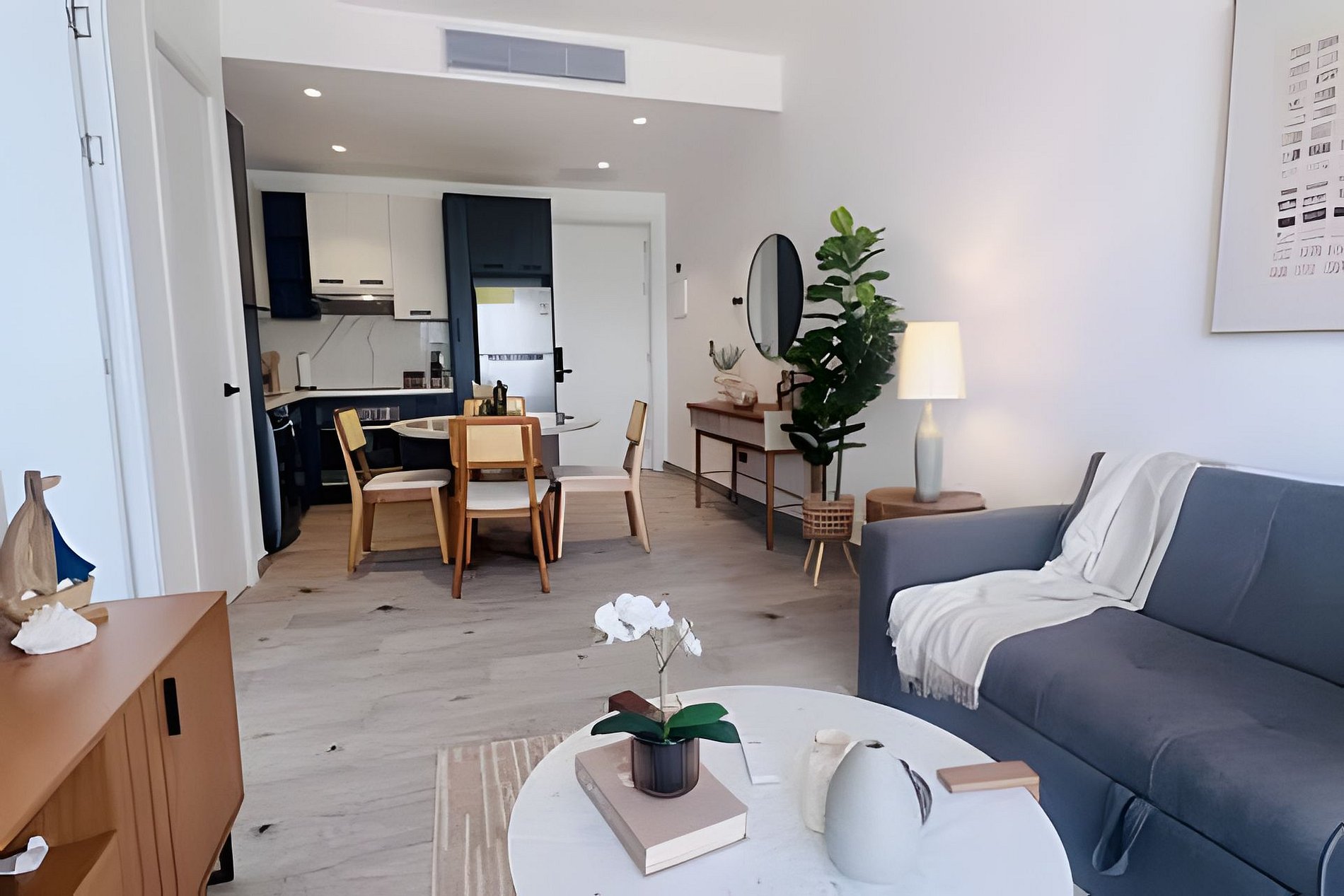 El apartamento cuenta con una habitación amplia y luminosa, equipada con aire acondicionado y decoración moderna que crea un ambiente relajante y acogedor. La cama confortable y el espacio bien distribuido garantizan descanso y privacidad. La sala de estar es cómoda y funcional, ideal para relajarte después de un día de playa o excursiones. La cocina está totalmente equipada con todo lo necesario para preparar tus comidas con facilidad. Cada espacio ha sido pensado para brindar comodidad, practicidad y una experiencia placentera durante tu estadía en Vistacana.